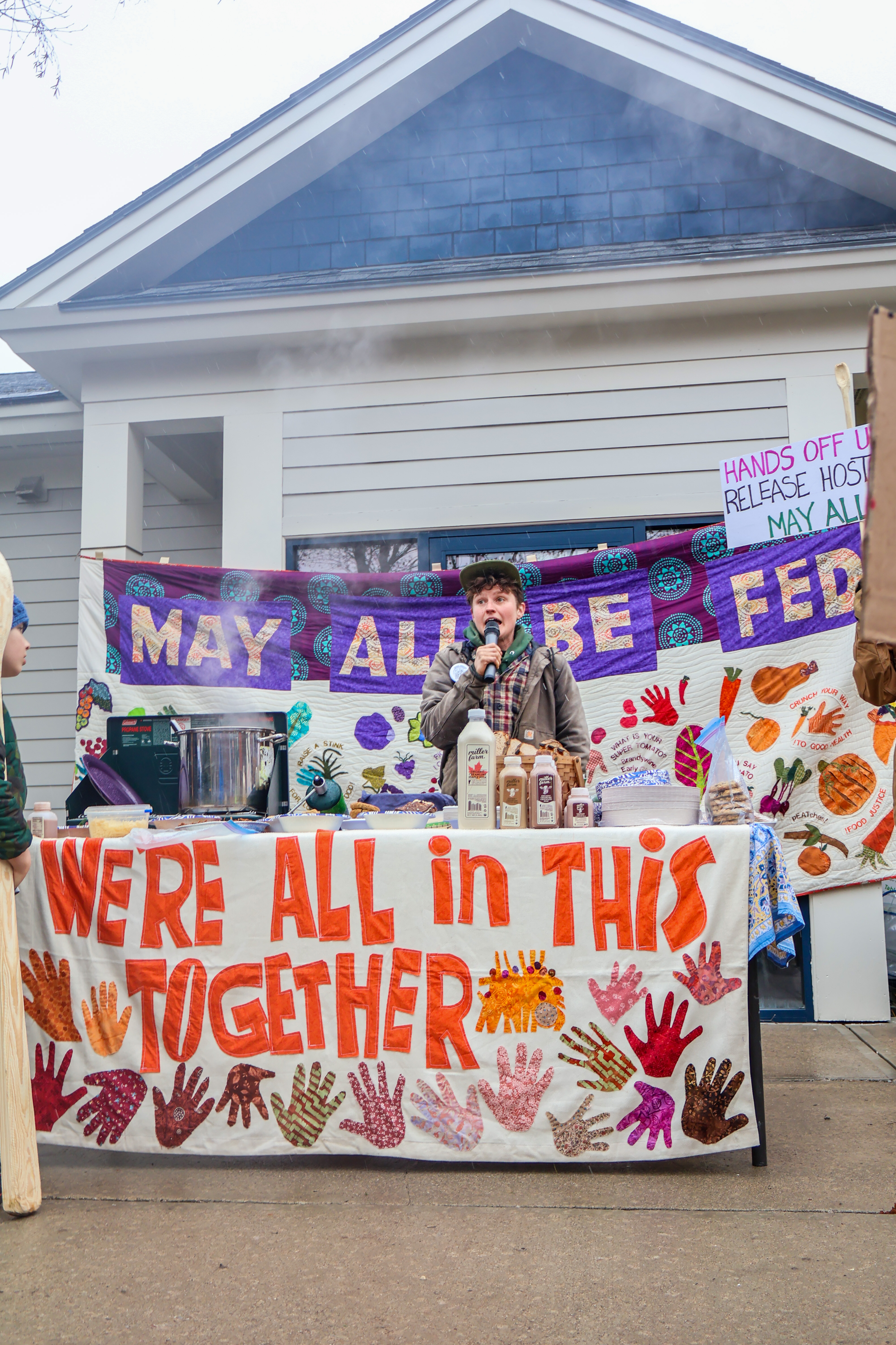 Attendees also brought food to share to model that when we work together, we can keep each other fed. A pile of bread baked with local grains, local organic chocolate milk, and a steaming pot of shared soup added warmth and joy to the evening, even as speakers addressed serious challenges. The gathering closed with a collective call for federal leaders to prioritize people over profit and to reinvest in the future of small-scale, regenerative farming.